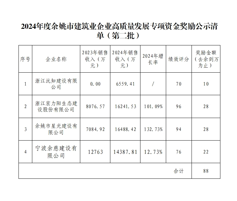 按照关于印发《〈余姚市人民政府关于推动产业高质量发展的若干意见〉的建筑业政策实施细则》的通知精神,我局会同财政局组织人员对各相关企业上报的资料进行了核实,现将2024年度建筑业高质量发展专项资金奖励金额向社会公示,详见附件。